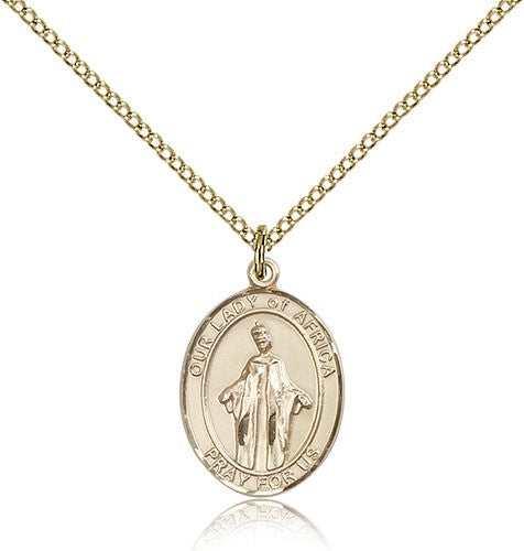 This Our Lady of Africa Pendant is made of gold filled and is approximately the size of a nickel. The jewelry pendant is paired with an 18 inch gold filled light curb chain as pictured. All medals are gift boxed in a beautiful blue velvet hinged jewelry gift box.