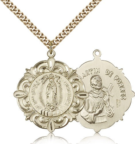 This Our Lady of Guadalupe Medal is paired with a 24 inch stainless steel gold-tone heavy curb chain as pictured. All medals are gift boxed in a light blue velvet jewelry box ready for gift giving.