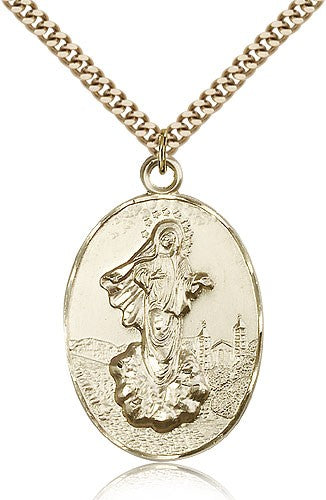 This Our Lady of Medugorje Medal is paired with a 24 inch stainless steel gold-tone heavy curb chain as pictured. All medals are gift boxed in a light blue velvet jewelry box ready for gift giving.
