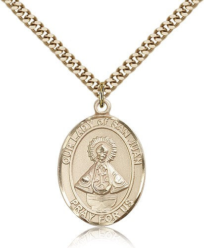 Our Lady of San Juan Medal This Our Lady of San Juan Pendant is made of gold filled and is approximately the size of a quarter. The jewelry pendant is paired with a 24 inch gold filled heavy curb chain as pictured. All medals are gift boxed in a beautiful blue velvet hinged jewelry gift box.