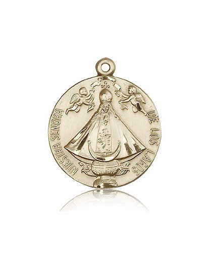 This Senora De Los Lagos Medal is made of 14 Karat Gold. The jewelry pendant is sold as pictured and does not come with a chain. All medals are gift boxed in a light blue velvet jewelry box ready for gift giving.