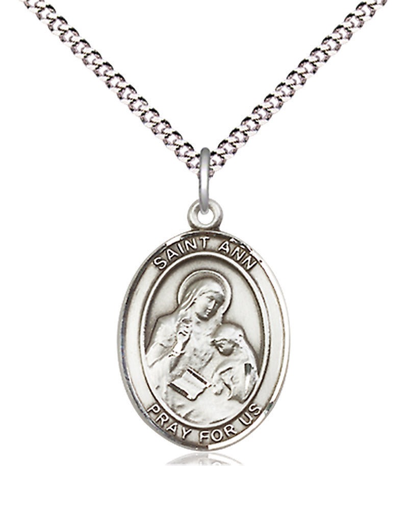 An oval shaped, dime size pendant with an image of St. Ann in the center. There is a selection of chains to choose from.