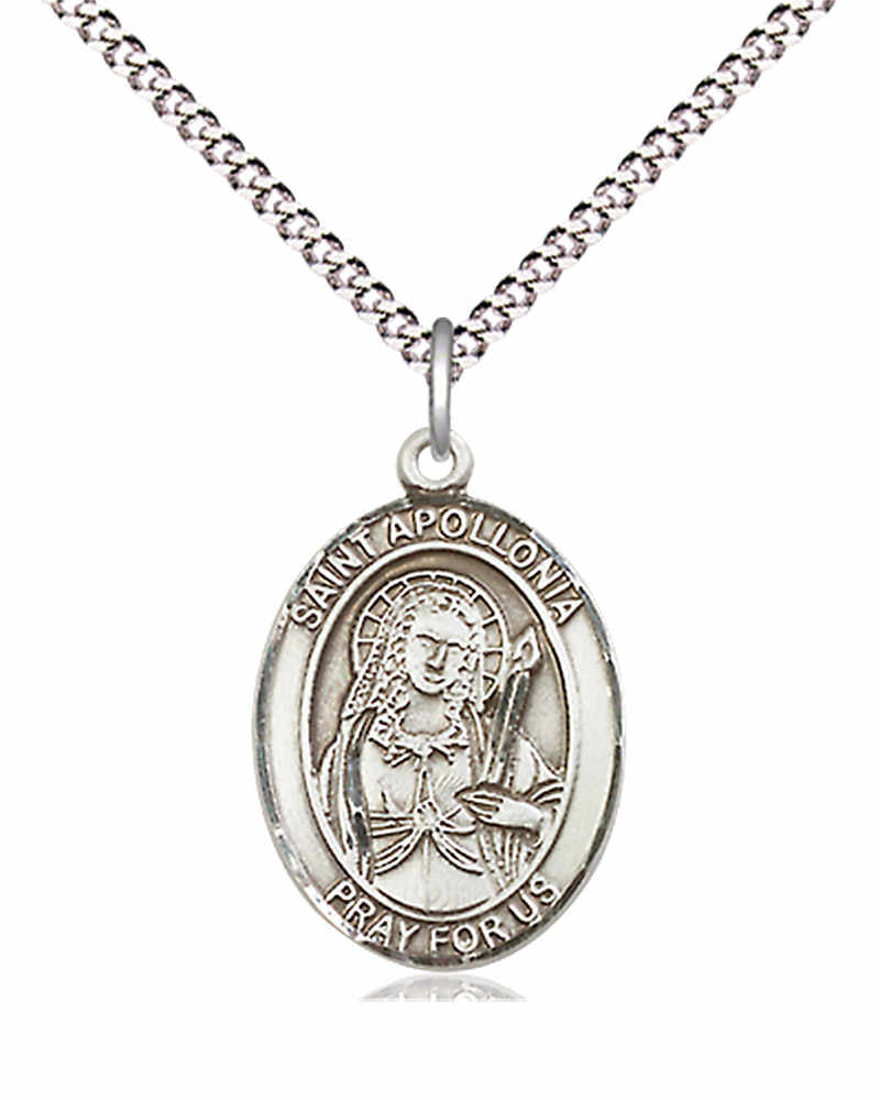 An oval shaped, dime size pendant with an image of St. Apollonia in the center. There is a selection of chains to choose from.