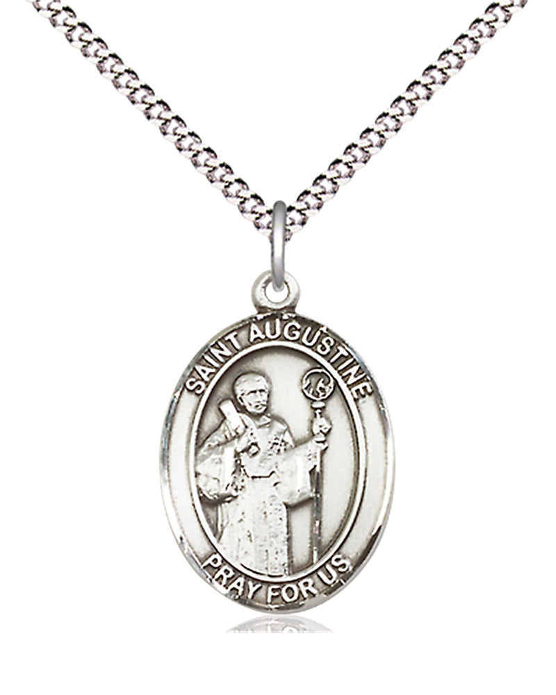 An oval shaped, dime size pendant with an image of St. Augustine in the center. There is a selection of chains to choose from.
