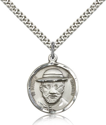 This Blessed Damian of Molokai Medal is paired with a 24 inch stainless steel heavy curb chain as pictured. All medals are gift boxed in a light blue velvet jewelry box ready for gift giving.