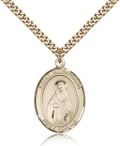 St. Hildegard Von Bingen Medal This St. Hildegard Von Bingen Pendant is made of gold filled and is approximately the size of a quarter. The jewelry pendant is paired with a 24 inch gold filled heavy curb chain as pictured. All medals are gift boxed in a beautiful blue velvet hinged jewelry gift box.