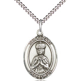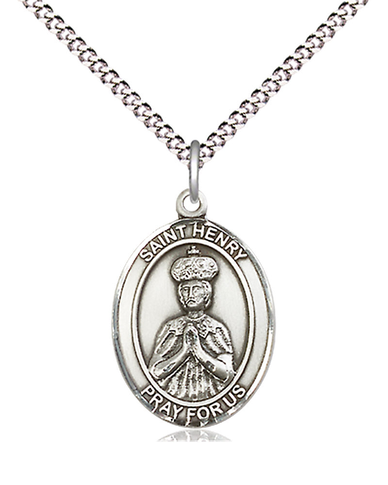 An oval shaped, dime size pendant with an image of St. Henry II in the center. There is a selection of chains to choose from.