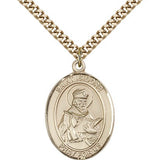 This St. Isidore of Seville Pendant is made of gold filled and is approximately the size of a quarter. The jewelry pendant is paired with a 24 inch gold filled heavy curb chain as pictured. All medals are gift boxed in a beautiful blue velvet hinged jewelry gift box.