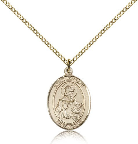 St. Isidore of Seville Medal This St. Isidore of Seville Pendant is made of gold filled and is approximately the size of a nickel. The jewelry pendant is paired with an 18 inch gold filled light curb chain as pictured. All medals are gift boxed in a beautiful blue velvet hinged jewelry gift box.