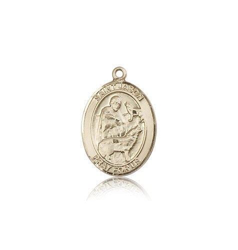St. Jason Medal This St. Jason Pendant is made of 14 Karat Gold and is approximately the size of a nickel. The jewelry pendant is sold individually and does not come with a chain. All medals are gift boxed in a beautiful blue velvet hinged jewelry gift box.