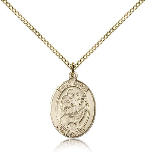 St. Jason Medal This St. Jason Pendant is made of gold filled and is approximately the size of a nickel. The jewelry pendant is paired with an 18 inch gold filled light curb chain as pictured. All medals are gift boxed in a beautiful blue velvet hinged jewelry gift box.