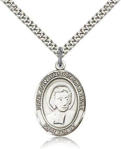 St. John Baptist De La Salle Medal This St. John Baptist De La Salle Pendant is made of sterling silver and is approximately the size of a quarter. The jewelry pendant is paired with a 24 inch stainless steel heavy curb chain as pictured. All medals are gift boxed in a beautiful blue velvet hinged jewelry gift box.
