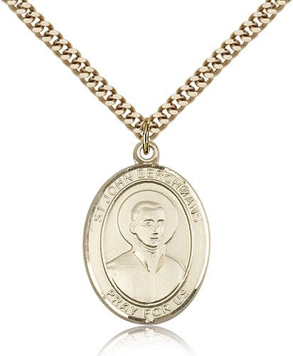 St. John Berchmans Medal This St. John Berchmans Pendant is made of gold filled and is approximately the size of a quarter. The jewelry pendant is paired with a 24 inch gold filled heavy curb chain as pictured. All medals are gift boxed in a beautiful blue velvet hinged jewelry gift box.