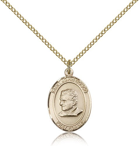 This St. John Bosco Pendant is made of gold filled and is approximately the size of a nickel. The jewelry pendant is paired with an 18 inch gold filled light curb chain as pictured. All medals are gift boxed in a beautiful blue velvet hinged jewelry gift box.