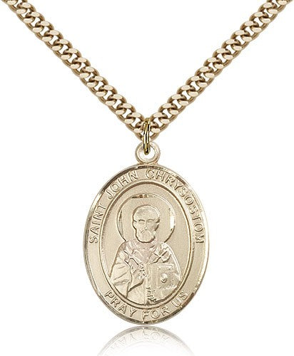 This St. John Chrysostom Pendant is made of gold filled and is approximately the size of a quarter. The jewelry pendant is paired with a 24 inch gold filled heavy curb chain as pictured. All medals are gift boxed in a beautiful blue velvet hinged jewelry gift box.