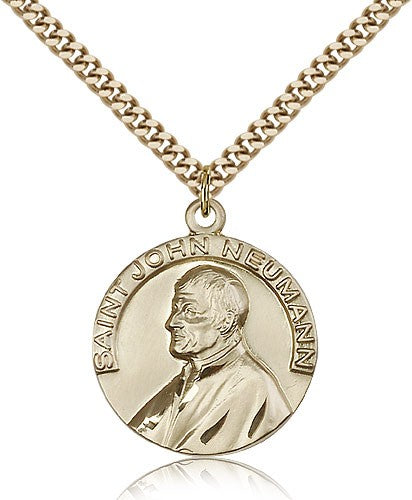 This St. John Neumann Medal is paired with a 24 inch stainless steel gold-tone heavy curb chain as pictured. All medals are gift boxed in a light blue velvet jewelry box ready for gift giving.
