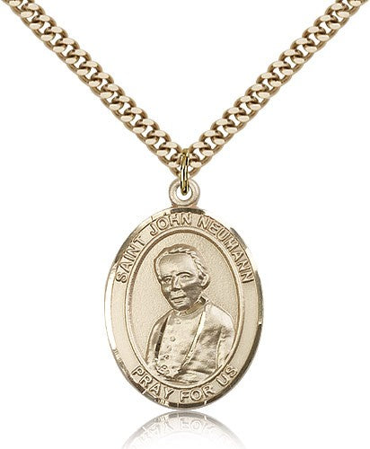 St. John Neumann Medal This St. John Neumann Pendant is made of gold filled and is approximately the size of a quarter. The jewelry pendant is paired with a 24 inch gold filled heavy curb chain as pictured. All medals are gift boxed in a beautiful blue velvet hinged jewelry gift box.