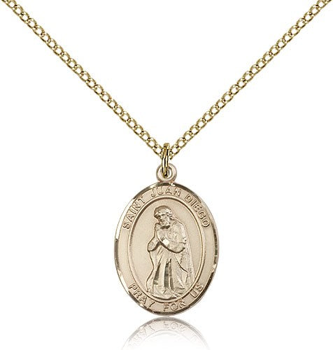 This St. Juan Diego Pendant is made of gold filled and is approximately the size of a nickel. The jewelry pendant is paired with an 18 inch gold filled light curb chain as pictured. All medals are gift boxed in a beautiful blue velvet hinged jewelry gift box.