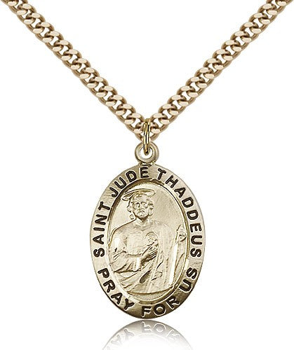 This St. Jude Medal is paired with a 24 inch stainless steel gold-tone heavy curb chain as pictured. All medals are gift boxed in a light blue velvet jewelry box ready for gift giving.