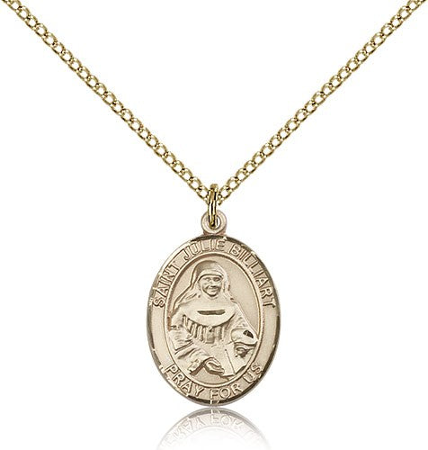 This St. Julie Billiart Pendant is made of gold filled and is approximately the size of a nickel. The jewelry pendant is paired with an 18 inch gold filled light curb chain as pictured. All medals are gift boxed in a beautiful blue velvet hinged jewelry gift box.