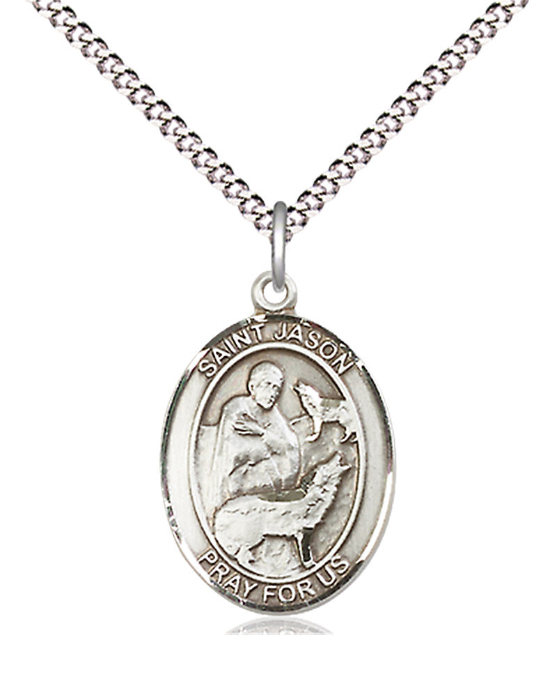 An oval shaped, dime size pendant with an image of St. Jason in the center. There is a selection of chains to choose from.