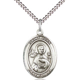 An oval shaped, dime size pendant with an image of St. John the Apostle in the center. There is a selection of chains to choose from.