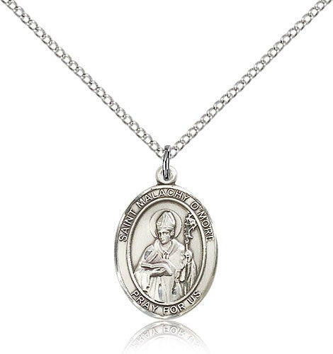 St. Malachy O'more Medal This St. Malachy O'more Pendant is made of sterling silver and is approximately the size of a nickel. The jewelry pendant is paired with an 18 inch sterling silver light curb chain as pictured. All medals are gift boxed in a beautiful blue velvet hinged jewelry gift box.