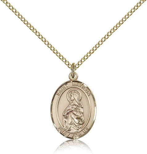 This St. Matilda Pendant is made of gold filled and is approximately the size of a nickel. The jewelry pendant is paired with an 18 inch gold filled light curb chain as pictured. All medals are gift boxed in a beautiful blue velvet hinged jewelry gift box.
