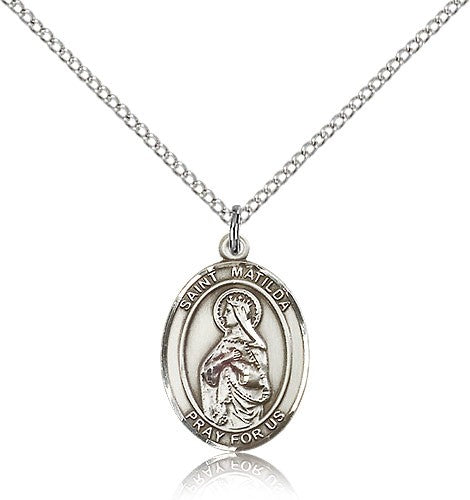 This St. Matilda Pendant is made of sterling silver and is approximately the size of a nickel. The jewelry pendant is paired with an 18 inch sterling silver light curb chain as pictured. All medals are gift boxed in a beautiful blue velvet hinged jewelry gift box.