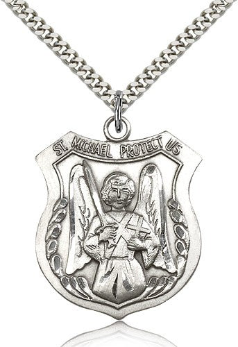 This St. Michael the Archangel Medal is paired with a 24 inch stainless steel heavy curb chain as pictured. All medals are gift boxed in a light blue velvet jewelry box ready for gift giving.