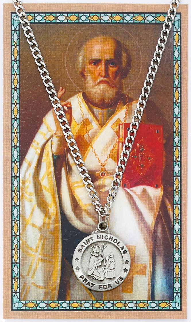 This St. Nicholas medal and prayer card combination makes for a wonderful keepsake. St. Nicholas was the patron saint of children, seaman and the hungry. The pendant show a wonderful image of St. Nicholas holding a bible with three young children at his feet. The pendant has the following features;