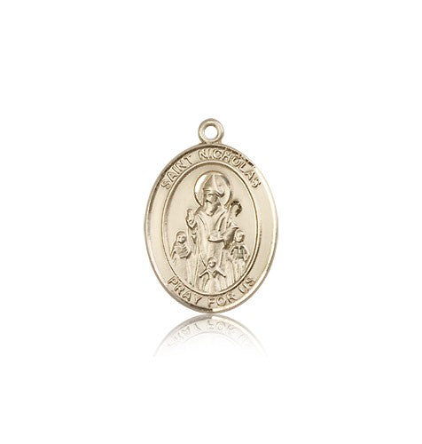 St. Nicholas Medal This St. Nicholas Pendant is made of 14 Karat Gold and is approximately the size of a nickel. The jewelry pendant is sold individually and does not come with a chain. All medals are gift boxed in a beautiful blue velvet hinged jewelry gift box.