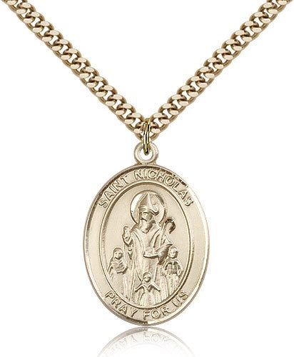 This St. Nicholas Pendant is made of gold filled and is approximately the size of a quarter. The jewelry pendant is paired with a 24 inch gold filled heavy curb chain as pictured. All medals are gift boxed in a beautiful blue velvet hinged jewelry gift box.