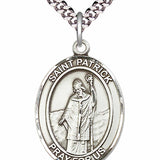 An oval shaped pendant with an image of St. Patrick in the center. There is a selection of chains to choose from.