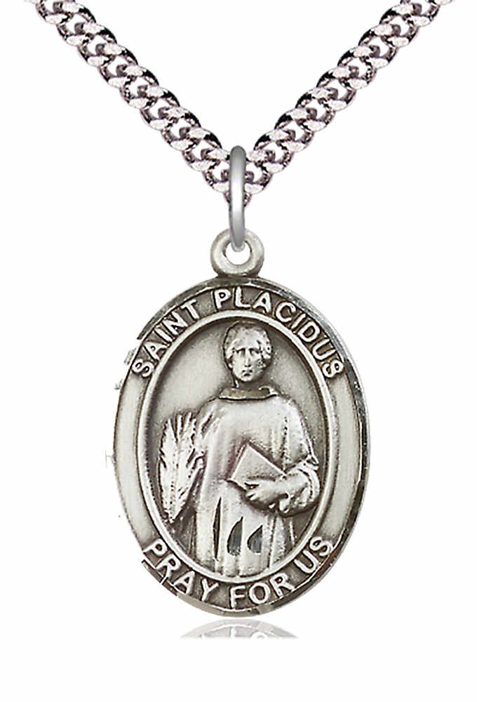 An oval shaped pendant with an image of St. Placidus in the center. There is a selection of chains to choose from.