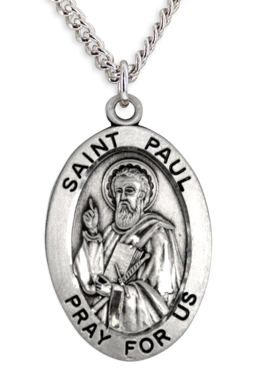 Saint Paul is one of the most popular and influential saints of all time and is displayed in the center of this necklace medallion holding a sword and the bible. He is the patron saint of writers and missionaries.