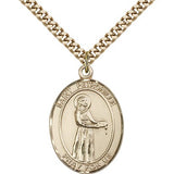 This St. Petronille Pendant is made of gold filled and is approximately the size of a quarter. The jewelry pendant is paired with a 24 inch gold filled heavy curb chain as pictured. All medals are gift boxed in a beautiful blue velvet hinged jewelry gift box.