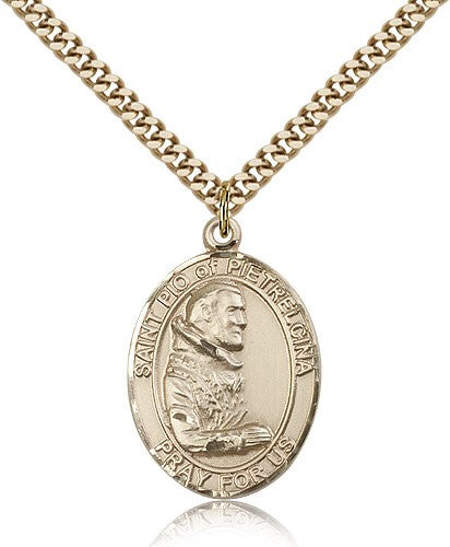 St. Pio of Pietrelcina Medal This St. Pio of Pietrelcina Pendant is made of gold filled and is approximately the size of a quarter. The jewelry pendant is paired with a 24 inch gold filled heavy curb chain as pictured. All medals are gift boxed in a beautiful blue velvet hinged jewelry gift box.