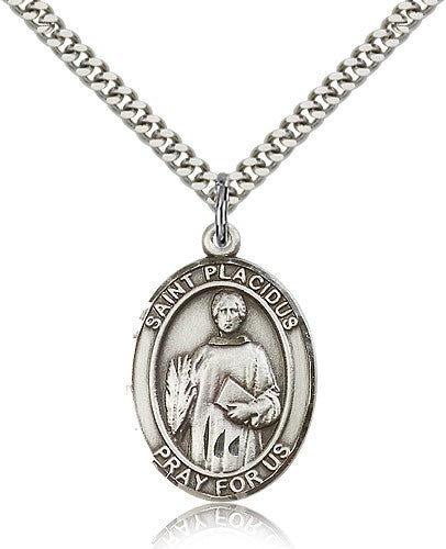 This St. Placidus Pendant is made of sterling silver and is approximately the size of a quarter. The jewelry pendant is paired with a 24 inch stainless steel heavy curb chain as pictured. All medals are gift boxed in a beautiful blue velvet hinged jewelry gift box.