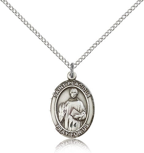 St. Placidus Medal This St. Placidus Pendant is made of sterling silver and is approximately the size of a nickel. The jewelry pendant is paired with an 18 inch sterling silver light curb chain as pictured. All medals are gift boxed in a beautiful blue velvet hinged jewelry gift box.