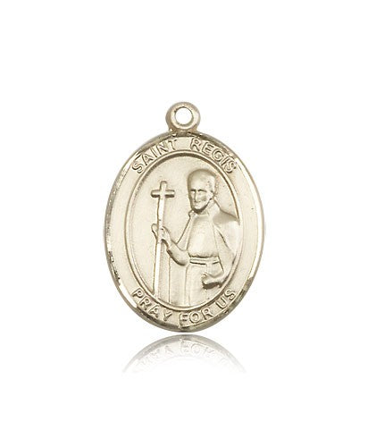 This St. Regis Pendant is made of 14 Karat Gold and is approximately the size of a quarter. The jewelry pendant is sold individually and does not come with a chain. All medals are gift boxed in a beautiful blue velvet hinged jewelry gift box.
