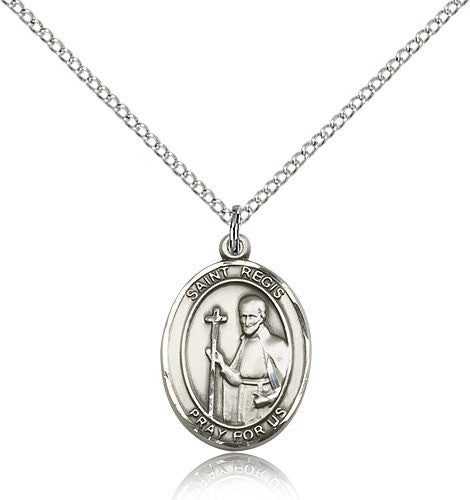 St. Regis Medal This St. Regis Pendant is made of sterling silver and is approximately the size of a nickel. The jewelry pendant is paired with an 18 inch sterling silver light curb chain as pictured. All medals are gift boxed in a beautiful blue velvet hinged jewelry gift box.