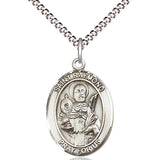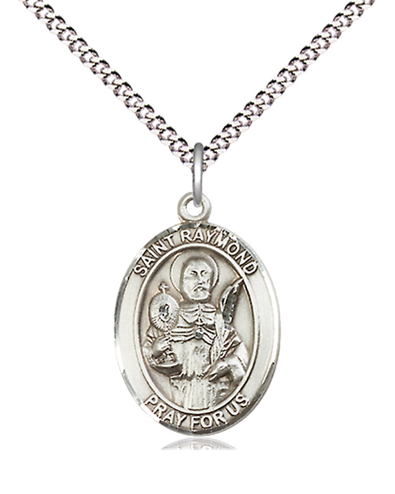 An oval shaped, dime size pendant with an image of St. Raymond Nonnatus in the center. There is a selection of chains to choose from.