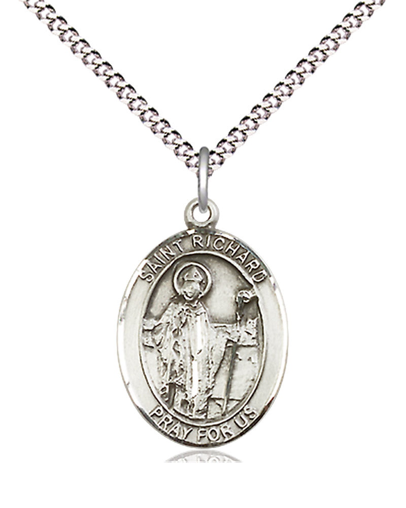 An oval shaped, dime size pendant with an image of St. Richard in the center. There is a selection of chains to choose from.