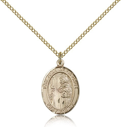 San Juan De La Cruz Medal This San Juan De La Cruz Pendant is made of gold filled and is approximately the size of a nickel. The jewelry pendant is paired with an 18 inch gold filled light curb chain as pictured. All medals are gift boxed in a beautiful blue velvet hinged jewelry gift box.