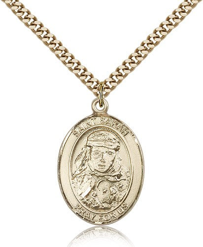 St. Sarah Medal This St. Sarah Pendant is made of gold filled and is approximately the size of a quarter. The jewelry pendant is paired with a 24 inch gold filled heavy curb chain as pictured. All medals are gift boxed in a beautiful blue velvet hinged jewelry gift box.