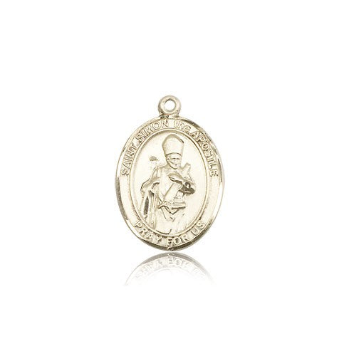 This St. Simon Pendant is made of 14 Karat Gold and is approximately the size of a nickel. The jewelry pendant is sold individually and does not come with a chain. All medals are gift boxed in a beautiful blue velvet hinged jewelry gift box.