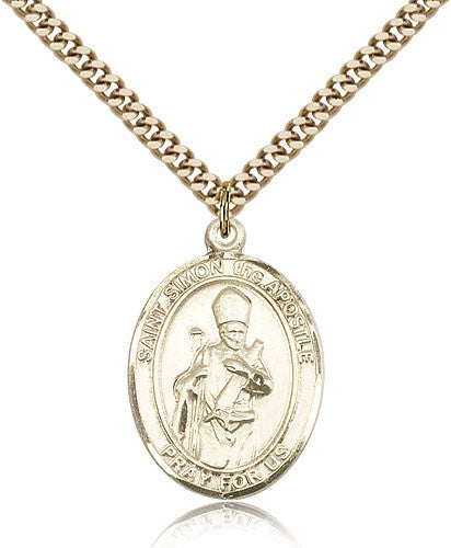 St. Simon Medal This St. Simon Pendant is made of gold filled and is approximately the size of a quarter. The jewelry pendant is paired with a 24 inch gold filled heavy curb chain as pictured. All medals are gift boxed in a beautiful blue velvet hinged jewelry gift box.