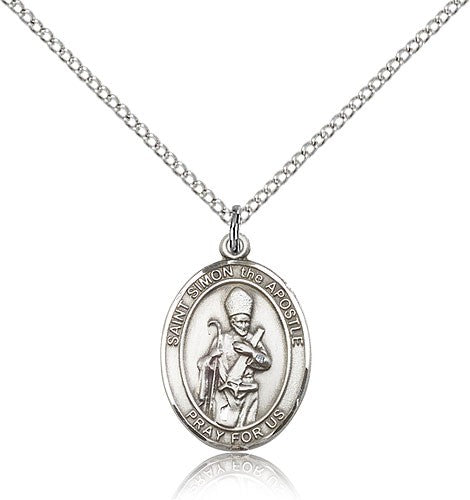 This St. Simon Pendant is made of sterling silver and is approximately the size of a nickel. The jewelry pendant is paired with an 18 inch sterling silver light curb chain as pictured. All medals are gift boxed in a beautiful blue velvet hinged jewelry gift box.