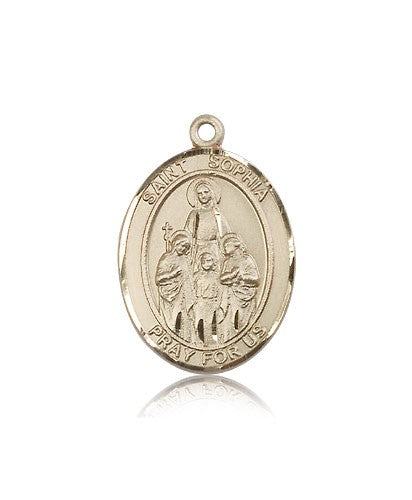 This St. Sophia Pendant is made of 14 Karat Gold and is approximately the size of a quarter. The jewelry pendant is sold individually and does not come with a chain. All medals are gift boxed in a beautiful blue velvet hinged jewelry gift box.